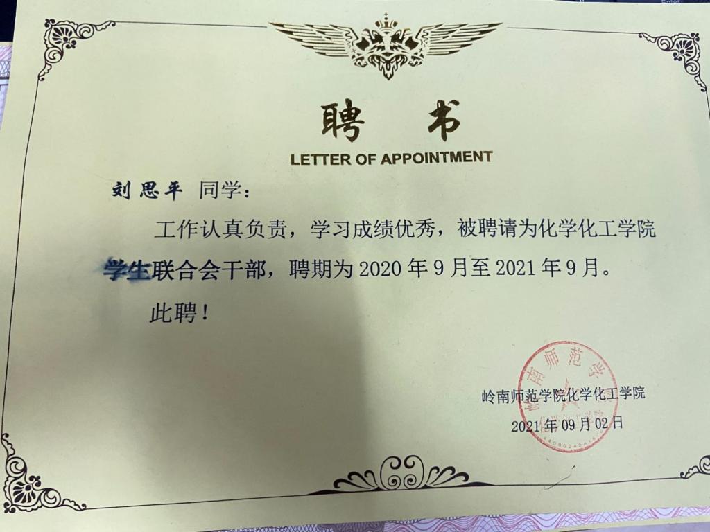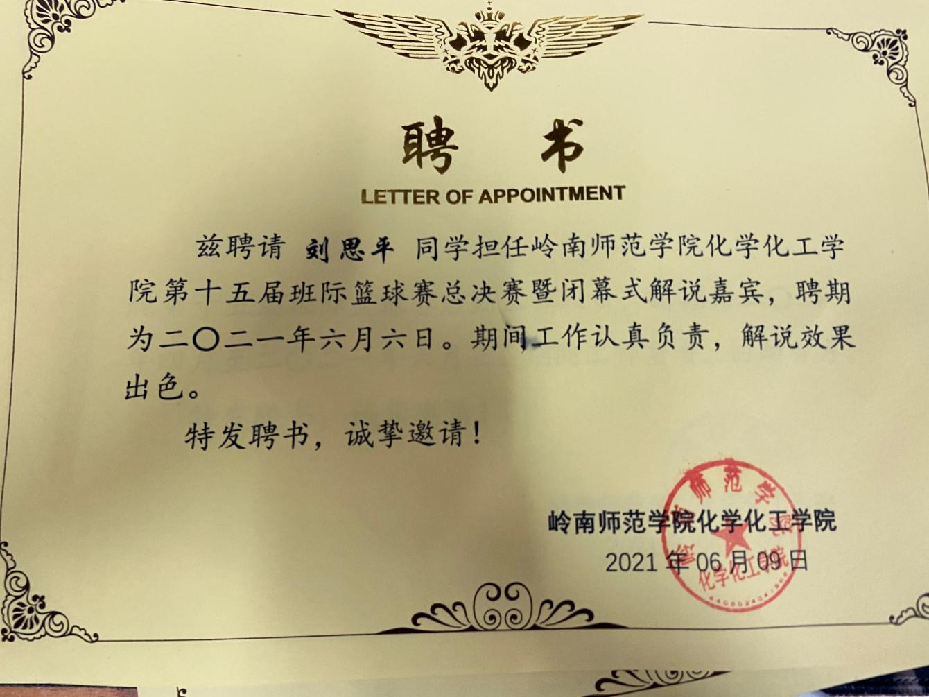 我是20化学4班的刘思平,现担任化学化工学院学生联合会体育部主要负责人一职。时光荏苒,我自2020年10月加入学生会体育部,转眼间已过了一年多,学生会是学生自我管理自我约束的团体,它在学生的日常工作中起到了积极有效的作用,而作为学生会的重要组成部分的“体育部”的作用更是不可磨灭,学生在学习的同时也要注重身体的锻炼,而我们体育部正是秉着“公平公正公开”的体育精神在学院领导的组织下积极为大家服务。