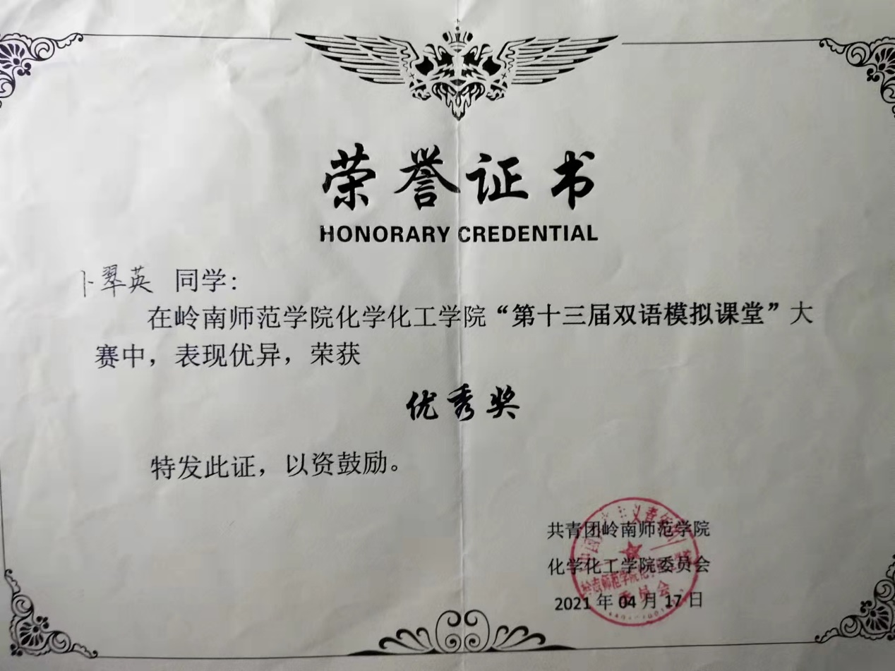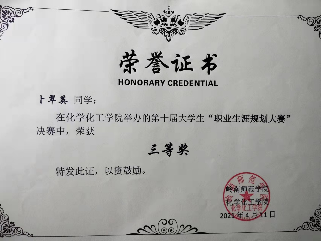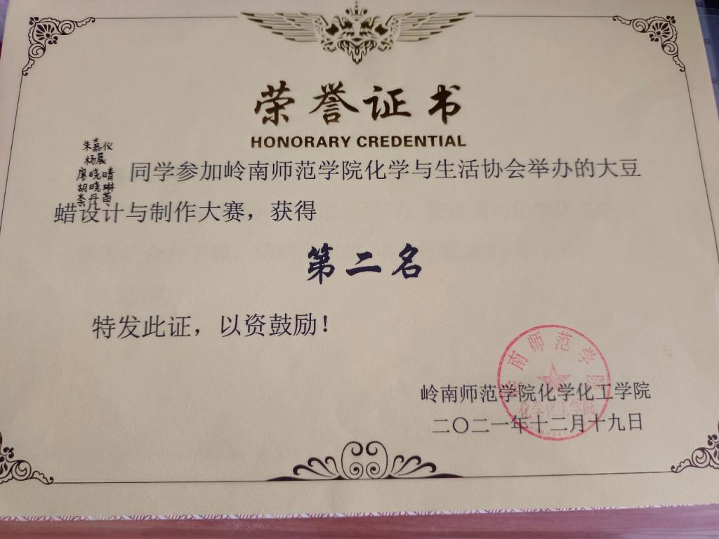 学习是学生的天职。本人认真学习专业课知识,上课认真听讲,做好笔记,利用空余时间阅读其他方面的书籍,开拓自身视野;并自学各种软件技能,例如PS、Pr、视频剪辑等,发展兴趣爱好。在职期间还加入了“化学与生活”社团,并带领小组获得“大豆蜡”比赛的第二名。