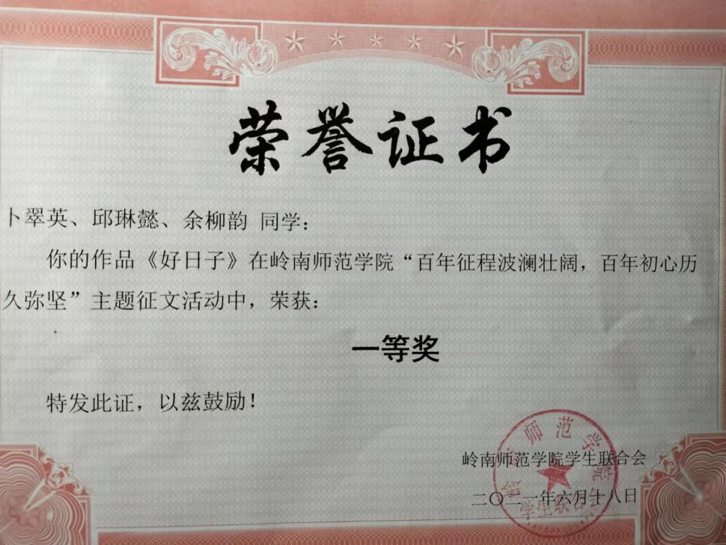 在积极完成各项工作的同时,我没有耽误自己的学业,合理安排工作与学习的时间,上课认真听讲、做笔记,不逃课、不旷课,课后认真完成老师布置的各项作业以及学习任务等,大一学年综测为2.40%。并且在课余时间为积极参加各种竞赛,并获得了双语课堂模拟比赛优秀奖、职业生涯规划三等奖、校征文一等奖、2022年小挑竞赛金奖、普译杯初赛二等奖。