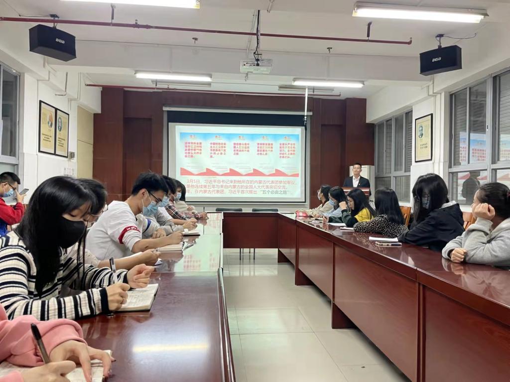 赵海波以《深入学习贯彻习近平总书记重要讲话精神,为祖国强盛担起青年学子应有的责任使命》为题,从“五个必由之路”、“五个战略性有利条件”等方面,深入浅出阐释习近平总书记在今年全国两会上的重要讲话精神。赵海波指出,青年大学生要立足国家新的发展阶段,深入学习习近平总书记系列重要讲话,特别是关于青年工作的重要讲话精神,不断传承中华优秀传统文化,从百年党史学习教育中汲取强大精神力量,融会贯通,茁壮成长。课堂上赵海波特别向党员学生骨干们提出四点希望:一要做“不忘初心、跟党走”的表率;二要做“刻苦学习、立志成才”的表率;三要做“敢于担当、创新奉献”的表率;四要做“修身立德、锤炼品格”的表率。