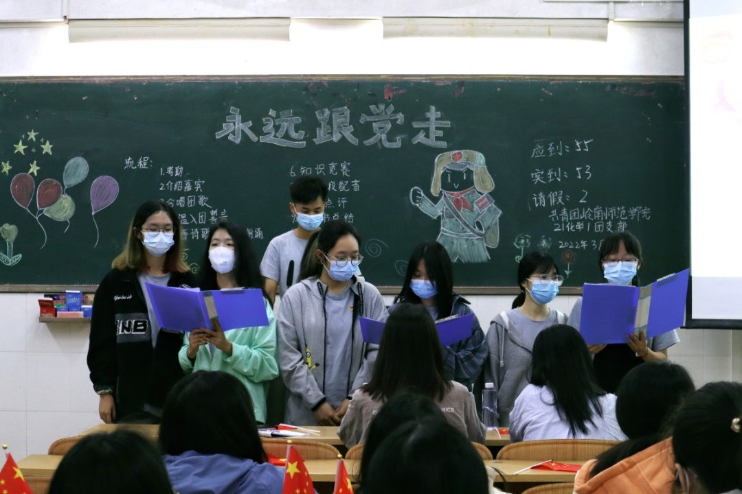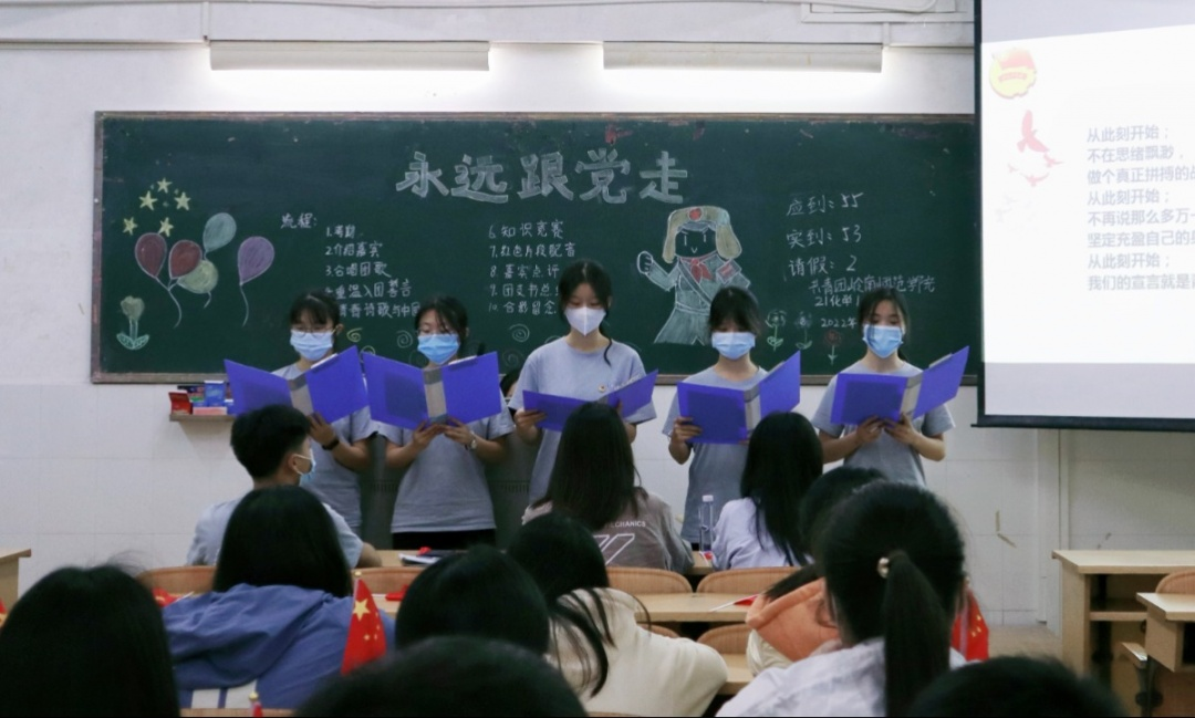 这一环节由21化学1团支书唐陈波带领同学们重温入团誓词,让同学们回忆起入团宣誓时慷慨激昂的心情,激发同学们爱国爱党的思想感情。