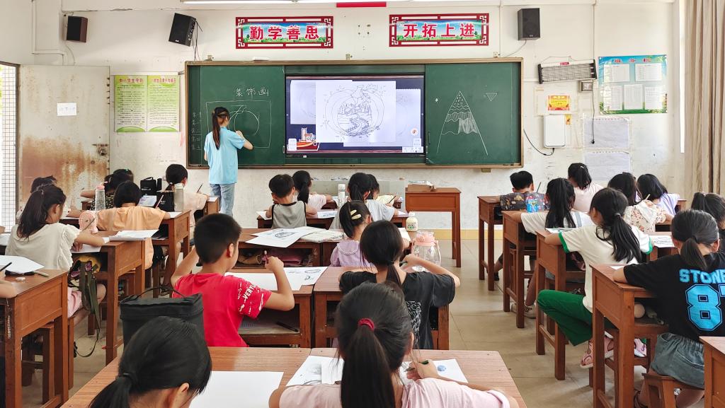 为了满足孩子对精神文化的追求,“岭梦”社会实践队队员钟老师为塘口中心小学的学生带来了一节关于装饰画的课程。