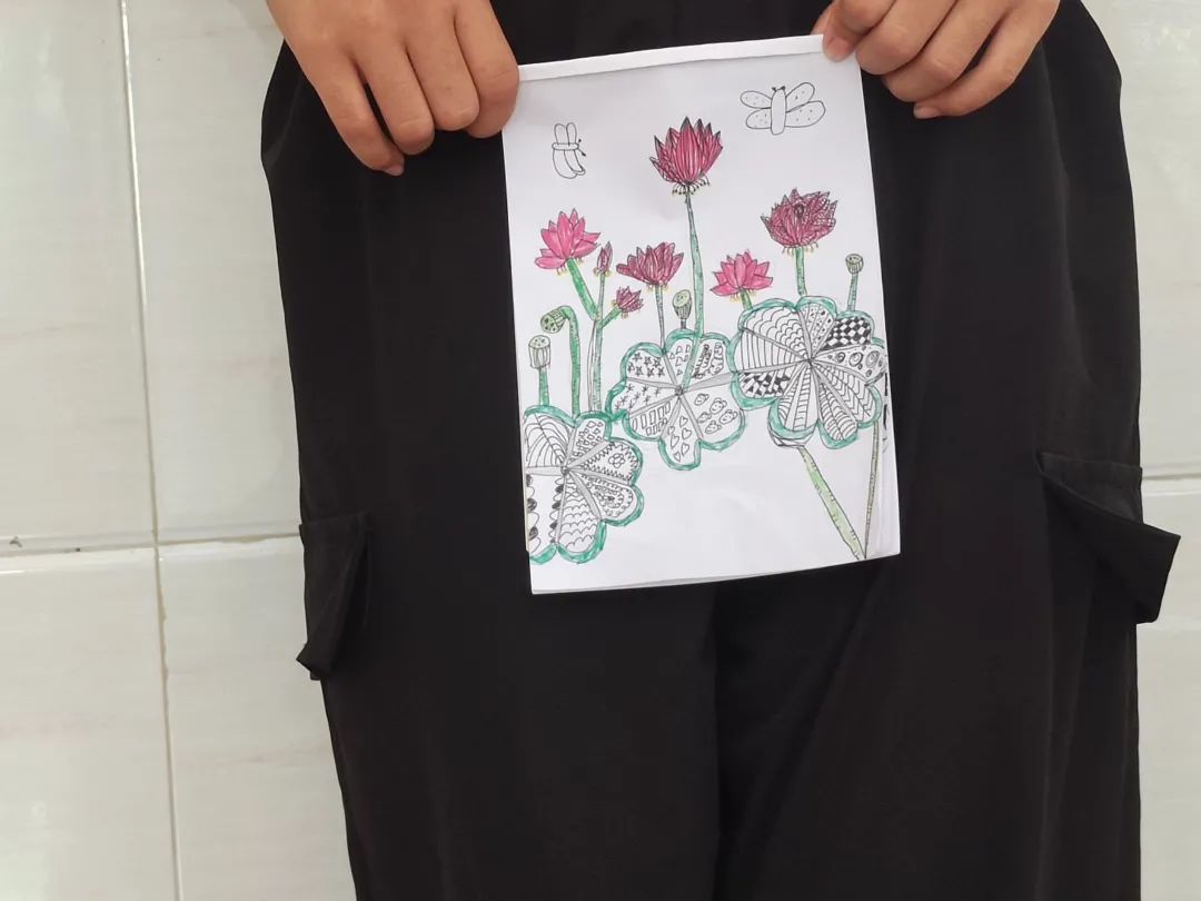 刘春茹老师还鼓励学生自己选择不同的图案对绘画进行填充,使学生们的画作更有特色更加丰富。时间偷偷从画笔笔尖溜走,到下课时间了,孩子们仍旧迟迟没有停下绘画的动作,笔尖下绘画着孩童独有的奇特想象,绘画着自己心目中最美的荷花。