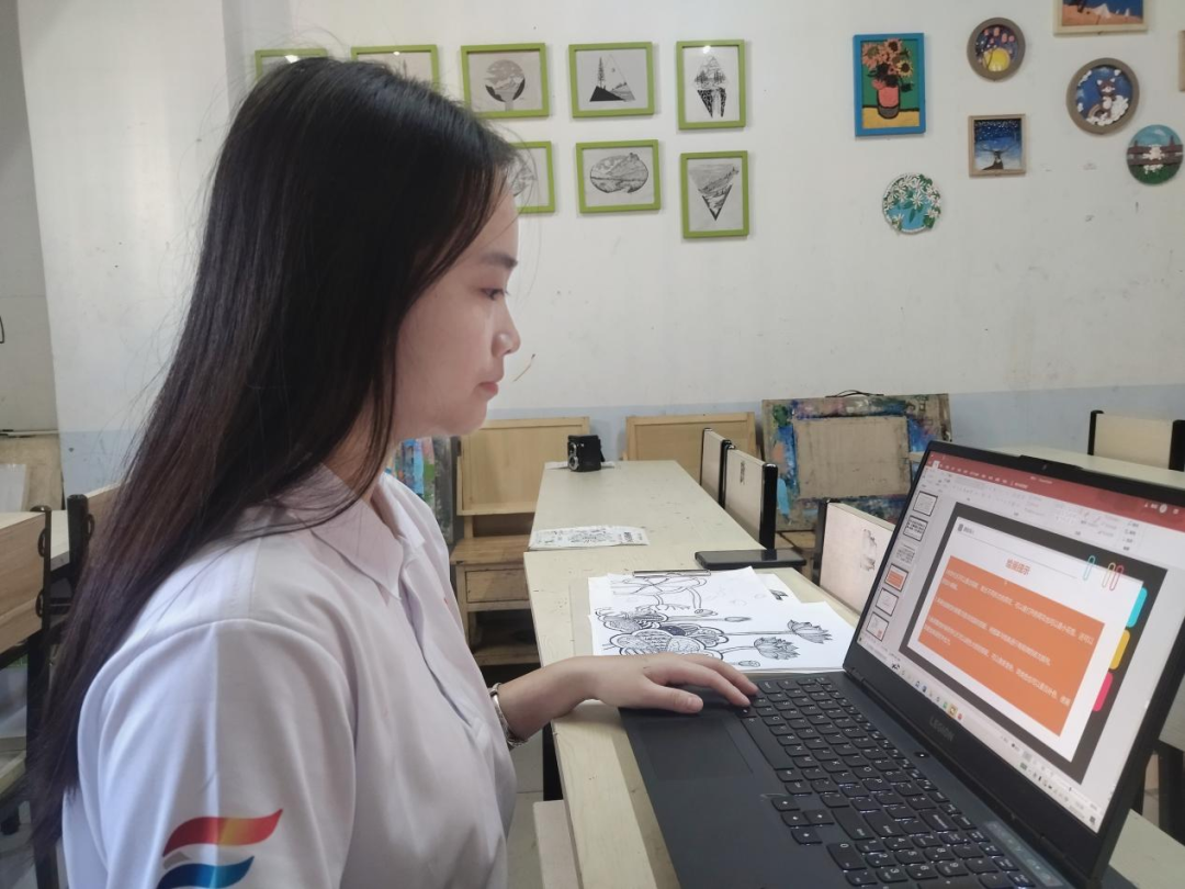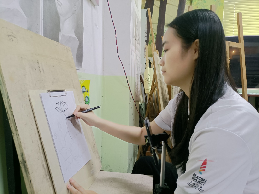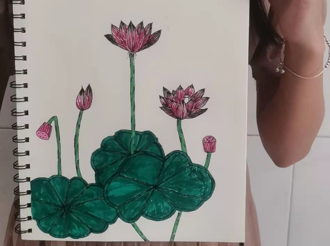 接天莲叶无穷碧,映日荷花别样红。荷花是夏日里最美丽的花,顶着烈日,开得娇艳而繁盛,给炎炎夏日带来一丝美丽的色彩。为“驱走”夏日带来的燥意,在新开展的美术课上,支教组成员刘春茹决定将此次的绘画主题定为:荷花。