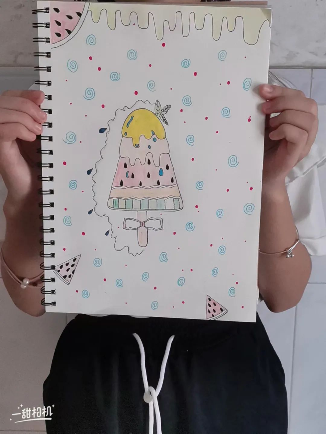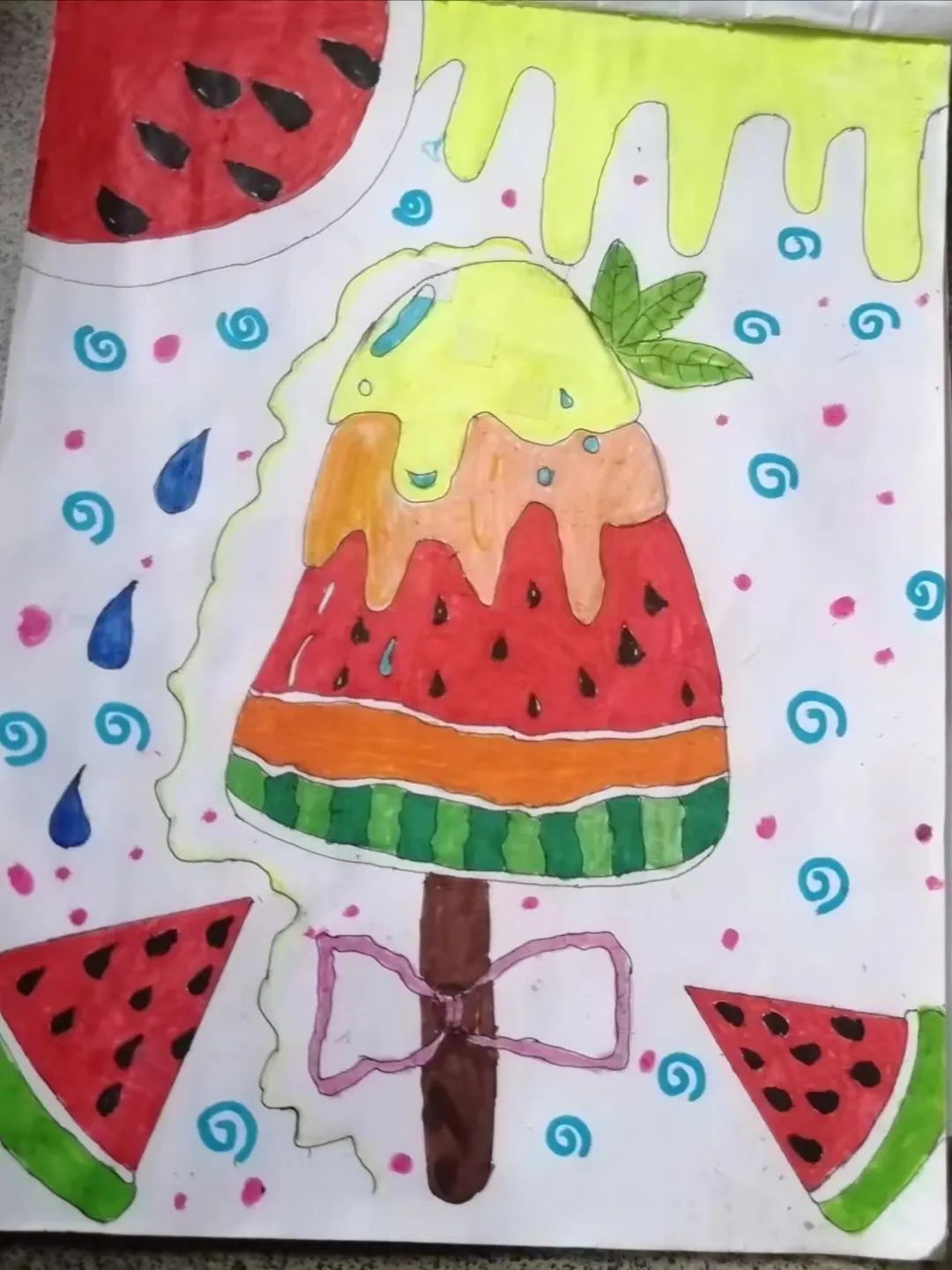 手工课老师陈日春还感慨到:“同学们的手工做的比我还好呀。”这一句,是欣慰,是鼓励,也是肯定。陈敏连老师则是教导学生,虽然课程结束,但人生还没有停下脚步,鼓励孩子们要向前跑,不要半途而废。绘画老师刘春茹为了督促孩子们继续学习,还为孩子们布置了期末作业—西瓜冰棍绘画。