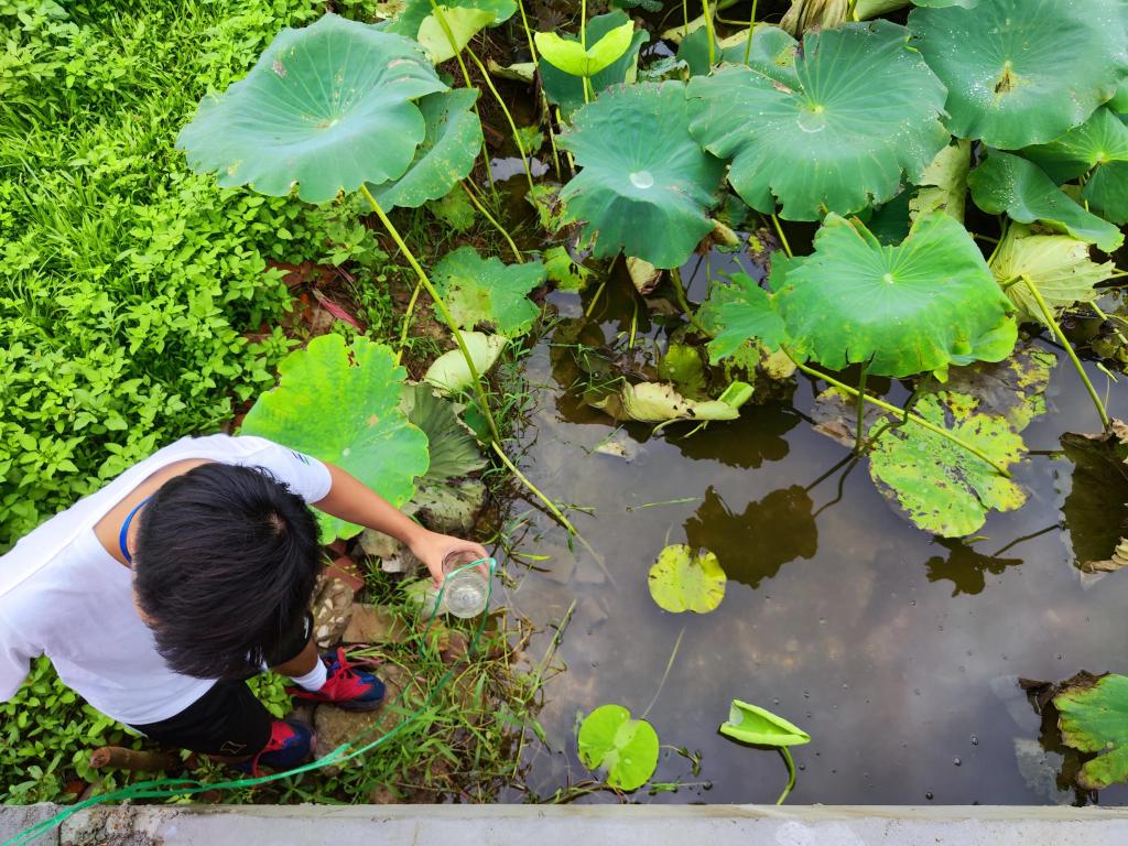 最后,调研组队员们经过瓦窑坡村的荷花塘。队长罗绿怡和队员陈柏宇合作采样交给其他组员保管整理,方便接下来的数据测量工作。
