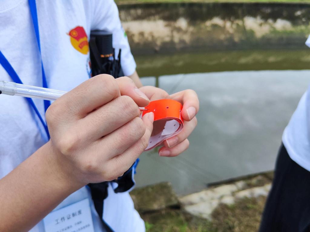 首先,调研组组长冯思琪带领队员步行抵达山口村水域的主河流, 她手持提前准备的工具率先进行水体取样工作,调研组队员们互帮互助,极大地加快了获取水体的工作进度,同时队员孙依钰讲究细节,为水体样本贴好标签,以防样本混乱。