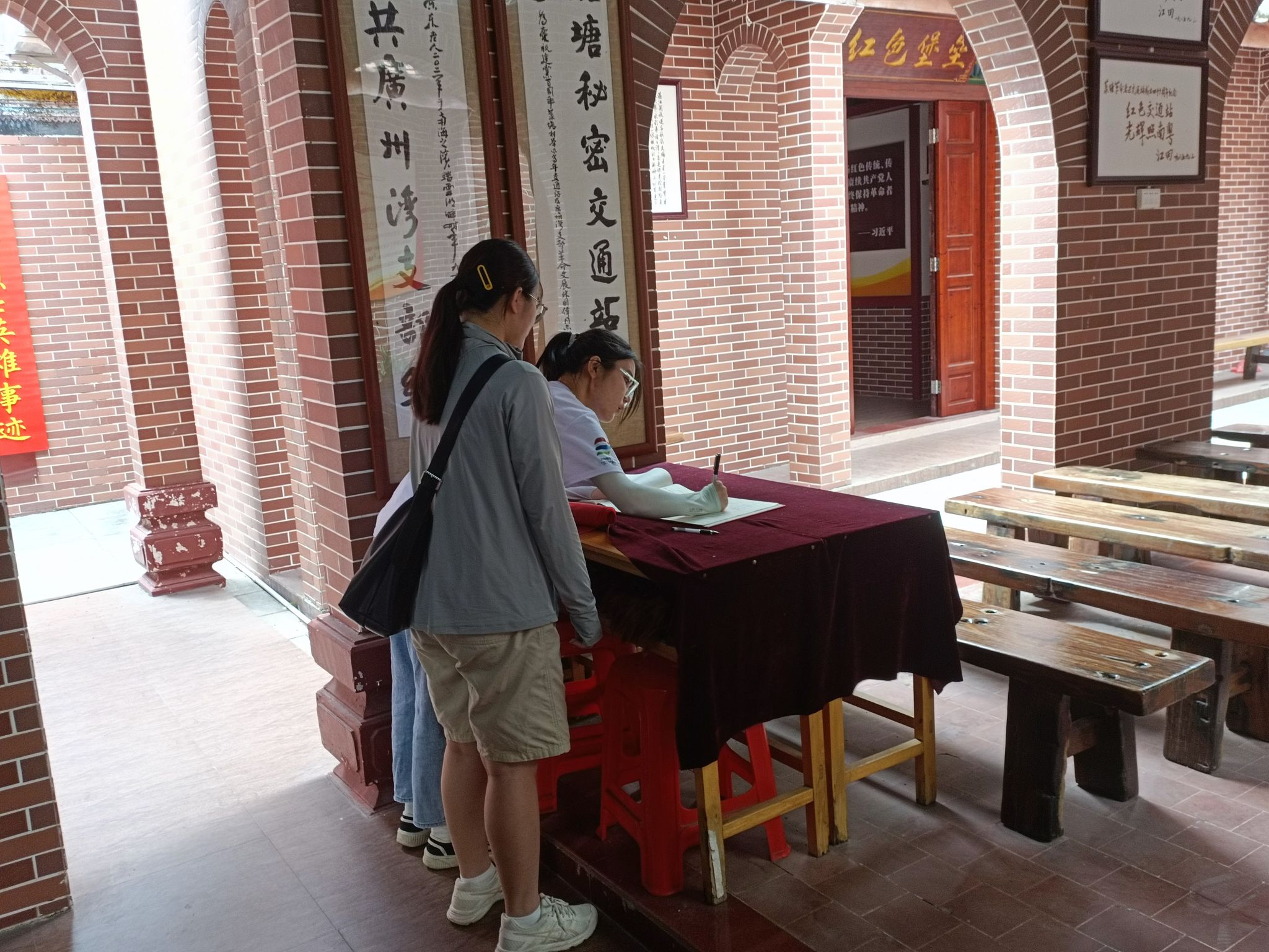 烈日当空,骄阳似火。“岭南之星”实践调研队伍怀着敬仰的心情,踏上新一次的调研征程,到菉塘村史展览室、菉塘交通站复原室、中共广州湾支部旧址、十二烈士英雄展览室、隐秘战线风云人物展馆、林其材事迹展览室等地方来了解交通站建立及运转过程中的艰难险阻,就当地群众问卷调查采访。