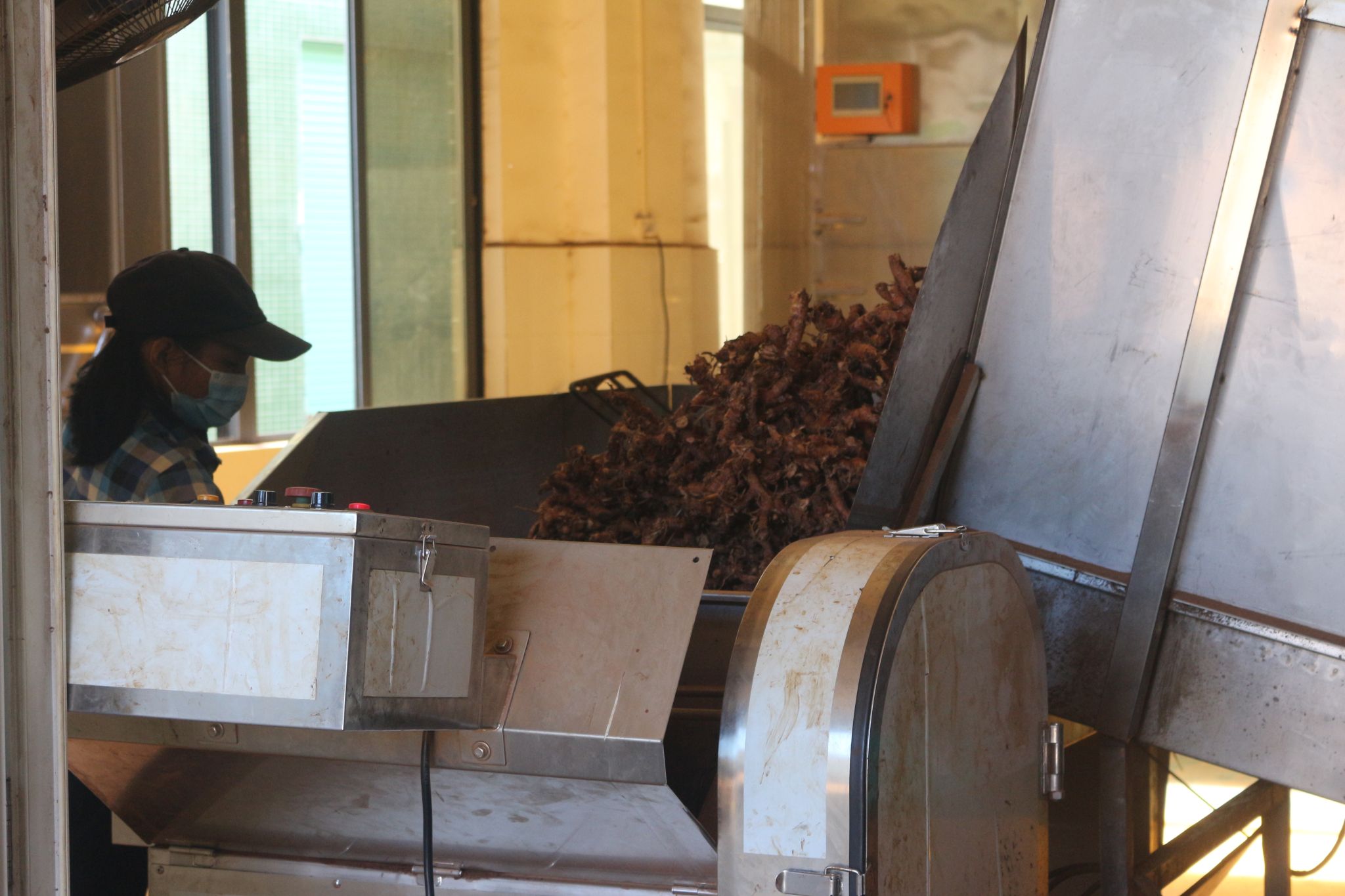 团队在负责人带领下,走进生产车间,了解到高良姜的生产流程。丰硒公司技术工人介绍到:“高良姜是先放进切片机里面,切片完之后再拿去烘干,然后烘干的话就拿出来晒, 如果碰上天气特别好的时候呢,就直接拿出来晒就可以了,这样又可以节省成本。”