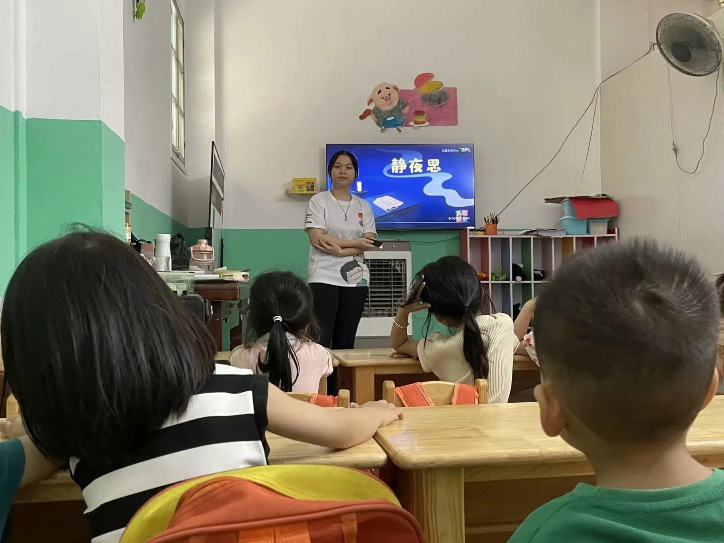 在了解完周恩来总理的爱国主义精神之后,支教组小李老师开始给小朋友学习古诗——静夜思,小李老师简单讲解完古诗之后,开始和他们做”击鼓传花“的游戏,音乐一停,”花“停到哪位小朋友的手上就要开始让他们当着大家的面把静夜思背出来。游戏的效果很好,幼儿园的大家都很快把这首古诗背熟了。