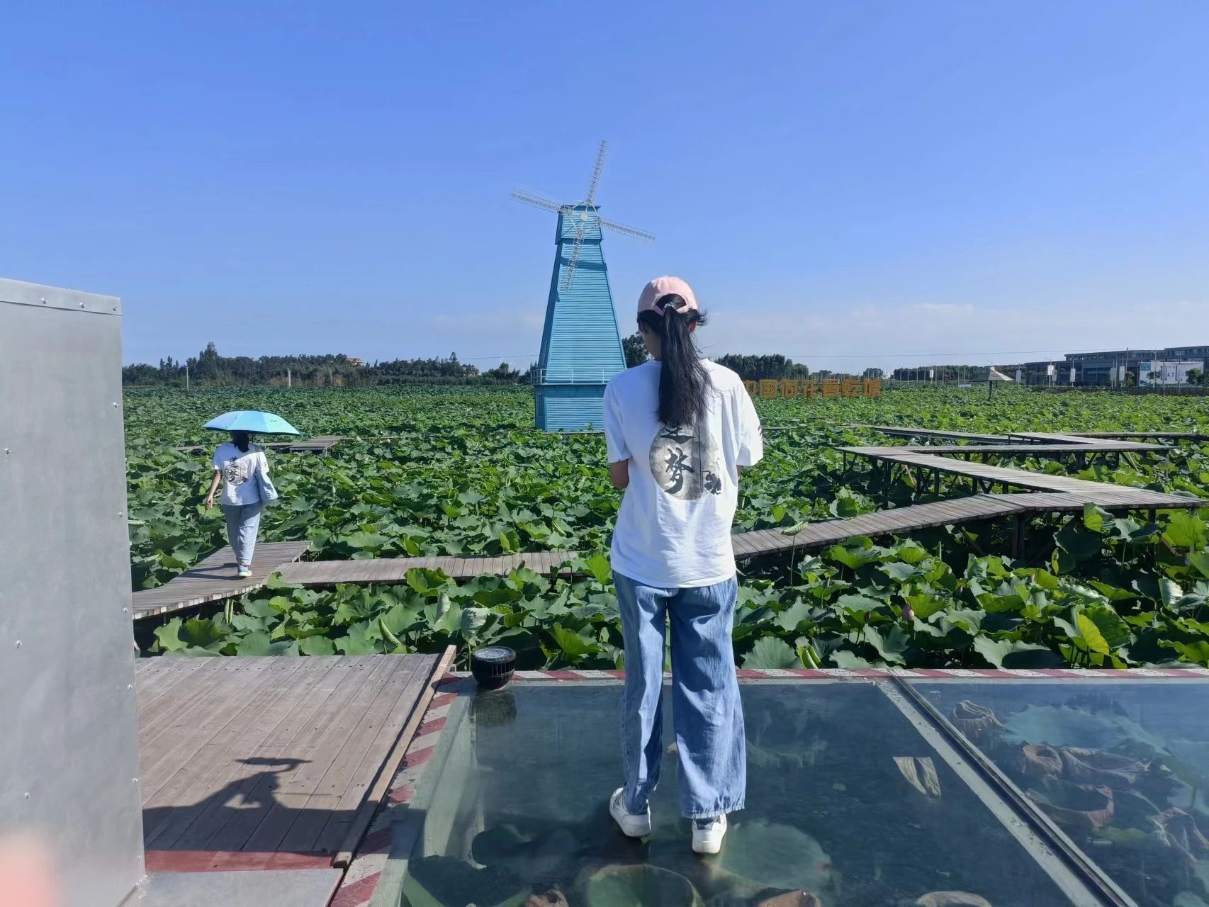 同时,摄影组的杨棋棋和祝金丽则用手机记录荷花世界的其他景物,如随风悠悠转动的风车和翡翠般的荷叶等。她们通过精准的构图和抓拍时机,成功捕捉到了乾塘荷花世界独特的风情与美景。