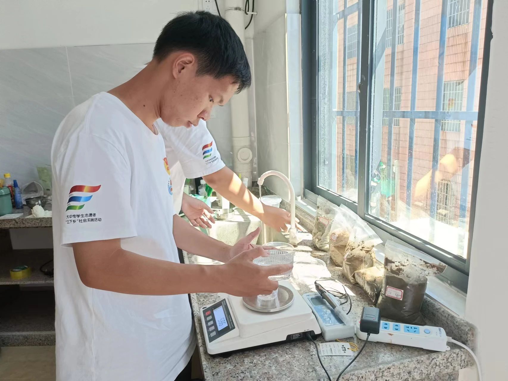 图为副队长赖俊在测定土壤酸碱度
