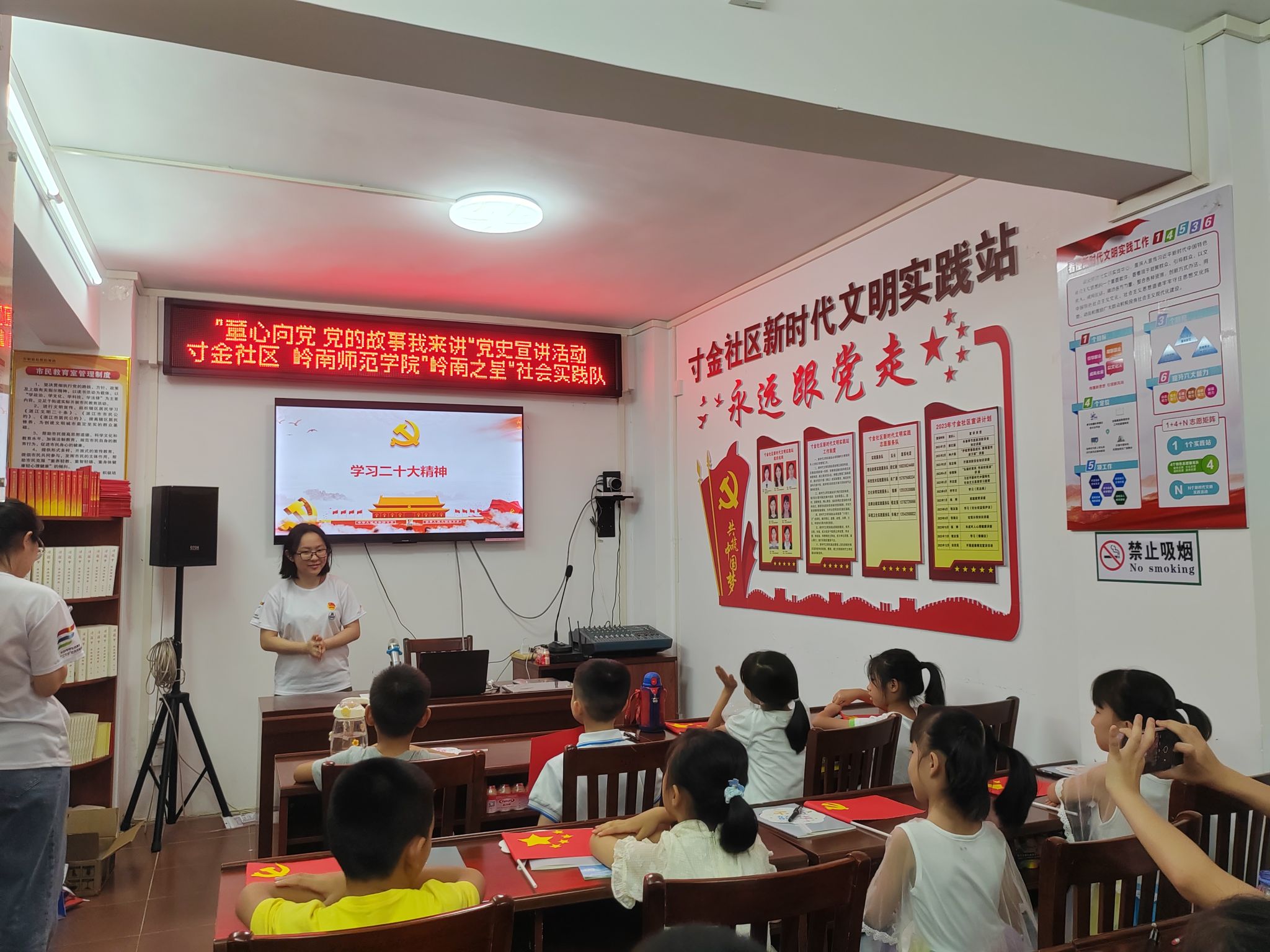 7月1日上午,为了深入学习党史,贯彻落实党的二十大精神,不断提高听党话、跟党走的自觉性,岭南师范学院“岭南之星”社会实践队伍于寸金社区向社区儿童开展童心向党活动。