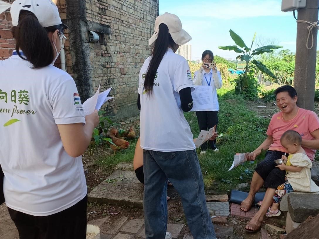 “向日葵”社会实践队走近各家各户,给不识字的老奶奶讲解关于国家助学贷款政策,在这盛夏,为乡村带去一缕清风,无不体现“向日葵”社会实践队的关怀。