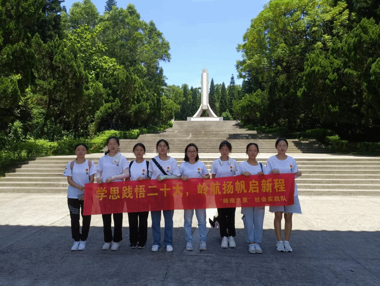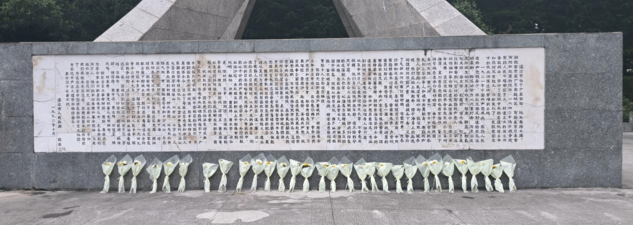 夏日炎炎,“岭南之星”实践调研队伍不惧烈日狂晒,怀着崇敬的心情,迈着沉重的步伐到寸金桥公园烈士陵园瞻仰烈士。寸金桥公园烈士陵园的前方建有一座碑坊,正面刻上“万古长青”、背面“百世流芳”溜金大字,随步梯拾级而上,映入眼帘的是雄伟庄严的烈士纪念碑,屹立于步梯顶颠山上。碑座正面刻上战绩撰写着叙述南路以至粤桂边区人民革命斗争腥风血雨的烽火历程与英烈们的光辉业绩。