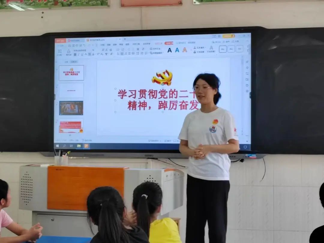 在党史教育介绍后,吴嘉雯队员开始仔细地给学生们讲解党的二十大。教导同学们,党的二十大与自身的联系,党对中国青年的期许。期望同学们都能成为爱党、敬党的人,不负时代,不负韶华,不负党和人民的殷切期望!