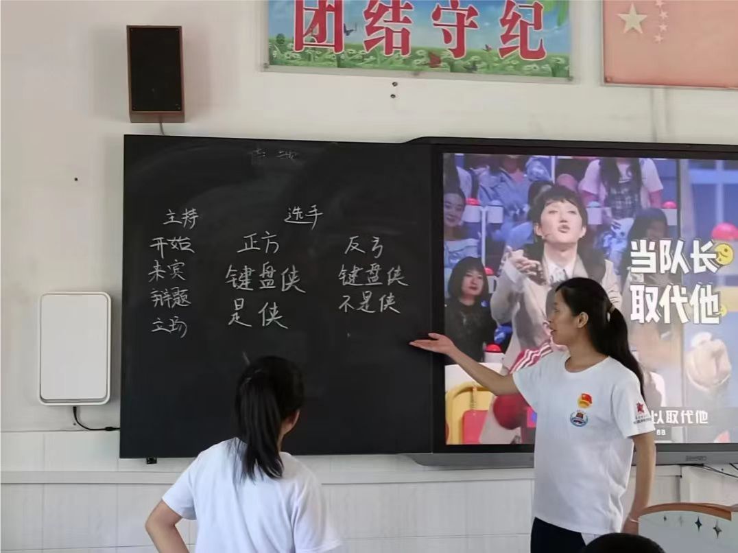 队员们先教导了同学们辩论赛的形式与赛制,引导他们开始发表自己的意见。同时观看《奇葩说》中专业辩手的辩论,一起讨论,发表感想。经过队员们的引导,同学们都敢于发表自己的看法,面对《奇葩说》里辩手的辩论,不盲信,坚持自己的观点,敢于反驳。