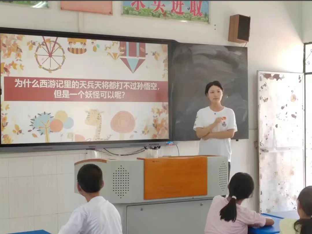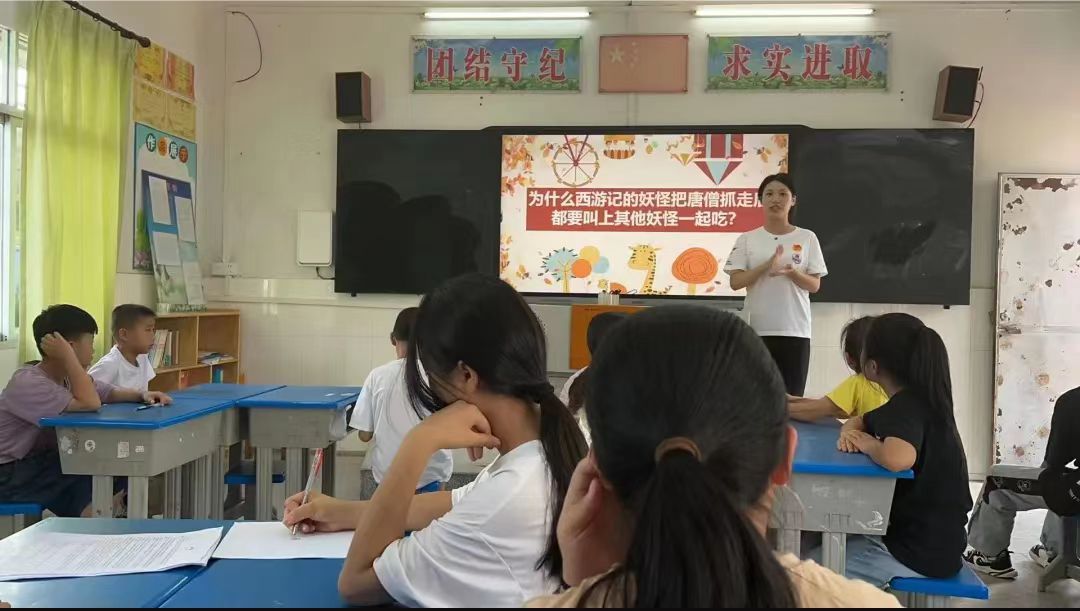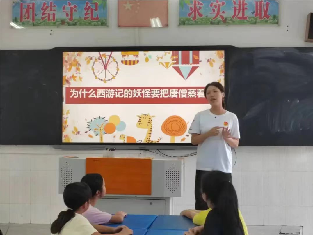 读书分享课由队员吴嘉雯负责进行,队员准备了耳熟能详的《西游记》,并从辩证思维提出了许多问题,和同学们一同探讨。