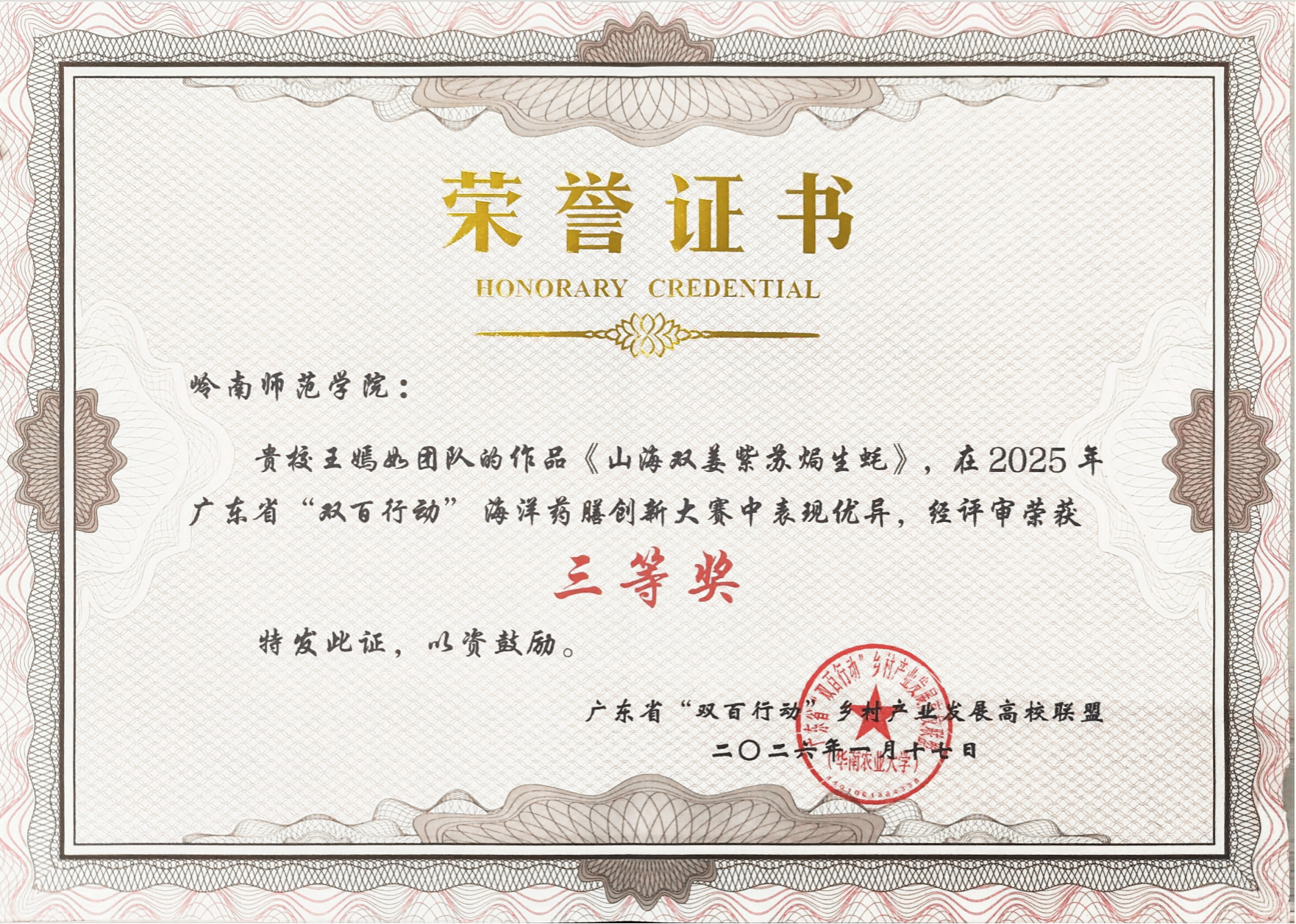 此次获奖是参赛学子不懈努力的成果,更是学院重视实践教学、着力培养高素质应用型人才的生动体现。我院始终聚焦 “双百行动”与乡村振兴战略需求,积极搭建学科竞赛与实践创新平台,鼓励学子将专业知识与地方产业发展相结合,扎根地方、服务地方,为推动海洋药膳产业发展、助力乡村振兴贡献更多岭师智慧与青春力量。