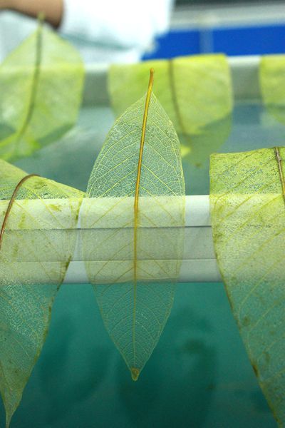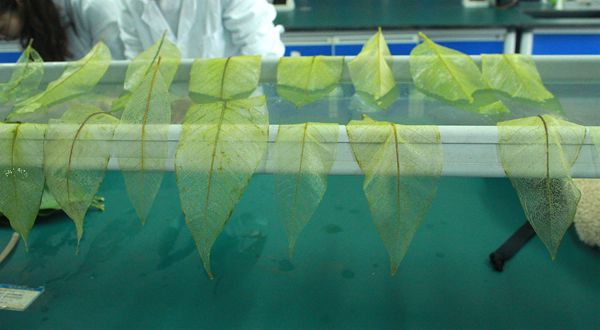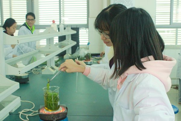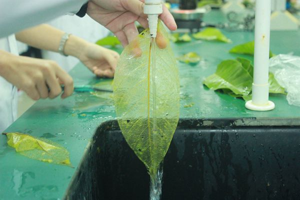 待主持人宣读完比赛注意事项,参赛选手纷纷进入煮叶片环节。他们插上电源对氢氧化钠溶液进行加热,再用镊子夹取叶子放入氢氧化钠溶液中。其原理是很多植物的叶脉由坚韧的纤维素构成,在碱液中不易煮烂,而叶脉四周的叶肉在碱液中容易煮烂。叶子在沸腾的氢氧化钠溶液中翻滚着,慢慢变黄。紧接着,参赛学生们用镊子夹出叶子,放在毛巾上,搭档们眼疾手快,即刻拿起刷子清理叶肉。他们合作默契,高效完成了叶片的处理。