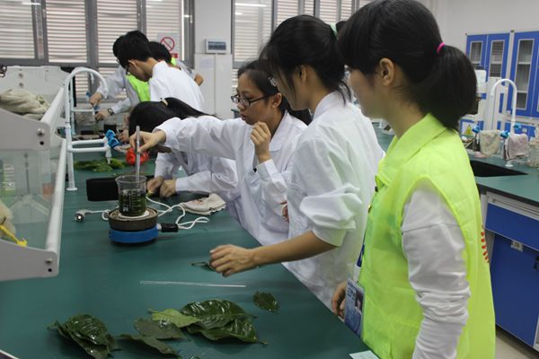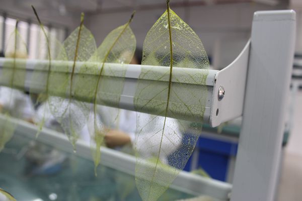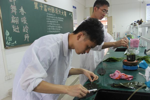 比赛期间,选手们将事先准备好的叶脉小心地放进烧杯进行煮沸,待叶子稍发黑时,便拿出来用牙刷仔细地刷。刷叶脉过程中,每位同学都聚精会神,态度认真。各组选手分工明确,一人负责煮叶子,另外两人负责刷叶脉。这次比赛专门刷叶脉,后续作品设计则由同学们私下进行创作。近2个小时的比赛时间里,每组选手都刷出了大小不一的精美叶脉。