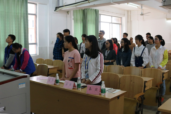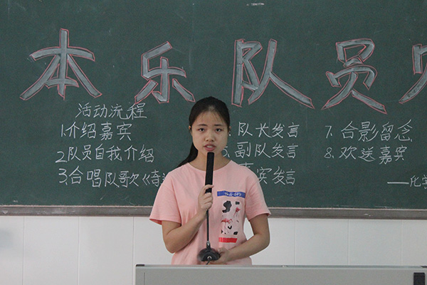 主持人介绍嘉宾后,会议进入到自我介绍环节。25名服务队队员先后上台展示自我风彩,表明为八小小学生服务和践行校本乐服务队“传递体育精神,提高自我能力”的宗旨,承诺将会团力合作、友好相处并为小学生们带去健康与欢乐。队员刘深丽表示,希望自己在教予学生体育知识的过程来提升奉献服务意识,为未来更好地服务于社会做铺垫;队员杨梅英是一名15级的插班生,为了不荒废光阴,她愿意做更多有意义的事情,这是她加入校本乐服务队的初衷;队员吴嘉凌讲述了在三下乡期间与小朋友愉快相处的经历,并希望通过参与服务队活动能够再次收获美好的历程。自我介绍环节后,全体人员合唱队歌《奇迹再现》,把本次会议推向了高潮。