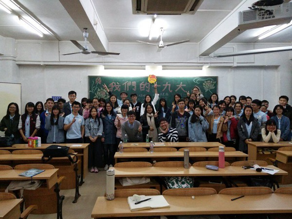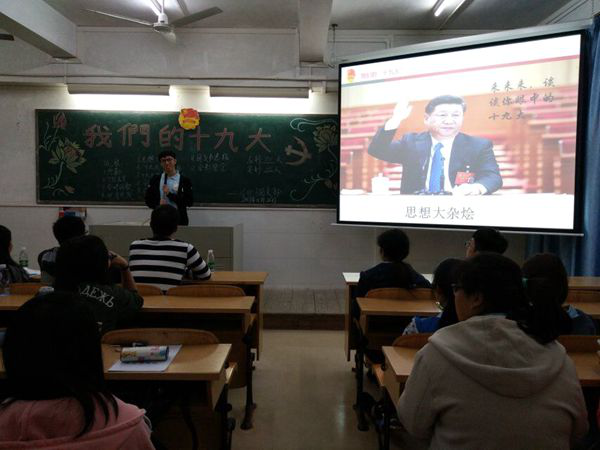 一首振奋人心的团歌《五月的花海》拉开了本次活动的序幕。学委赖敏捷同学播放精简的视频《十九大的报告》让大家对十九大有了深入的了解和看法。大家纷纷上台发表自己对十九大的观后感。陈菲宇同学结合我国实际情况讲述了自己对十九大中的关键词“精准扶贫”的认识和理解,讲述什么是精准扶贫,精准扶贫的特点以及成效。叶鸿飞同学则对十九大的“互联网+”作出了自己的理解,认为随着党的十九大的召开,互联网在生活中扮演着非常重要的角色。