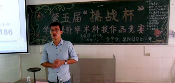 为了鼓励大学生勇于创新,迎接挑战,10月25日上午,化学化工学院团委创新创业部在燕雷楼C栋511教室举行第五届“挑战杯”大学生课外学术科技作品竞赛动员大会,出席本次会议的嘉宾有团委副秘书长李青年,校团委创新创业部干部莫小云和卓翼团队队员潘宝俊。