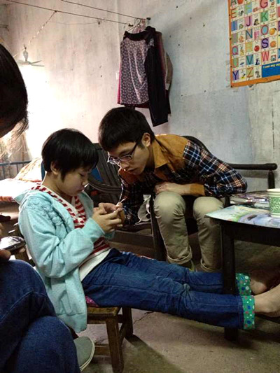 刚进门,黎翊茵就跑过来跟我们热情地问好。看见郭玉婷和梁冠贤带给她的书,她更是高兴地跳了起来。黎翊茵奶奶说,黎翊茵一直在等着郭玉婷和梁冠贤的到来。期间,黎翊茵先是跟梁冠贤说了一些学校里的情况,然后就立即翻开新买的书一个一个地给他介绍。尽管梁冠贤没看过那书,但还是认真地听黎翊茵讲着。不久之后,黎翊茵又玩起梁冠贤的手机来,他就在一旁指导。郭玉婷则一直在一旁与黎翊茵的奶奶聊天,气氛融洽。