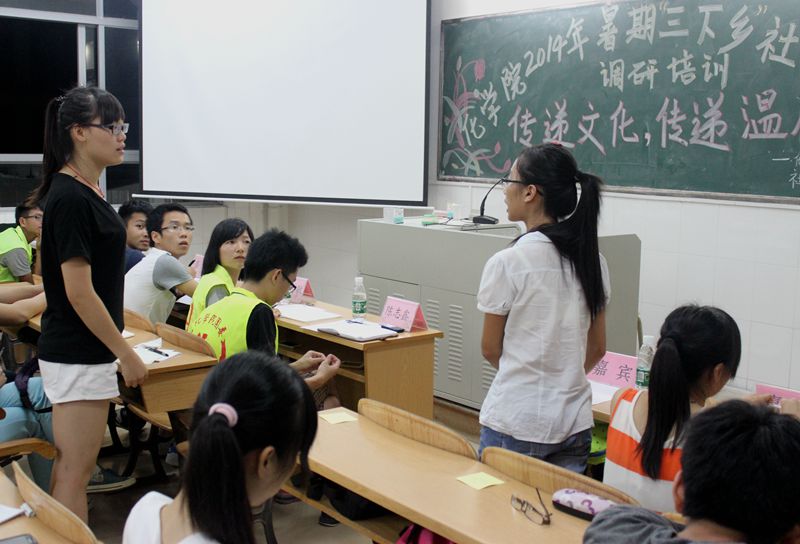 5月17日晚,化学院团委社会实践部与创新创业部在燕雷楼C711联合举办主题为“传递文化,传递温情”的暑假“三下乡”社会活动之调研培训。出席本次会议的有上年优秀实践队队员成婉莹与钟慧、校实践部干部、团委副秘书长梁智敏、陈志鑫及13级各支部调研组人员。