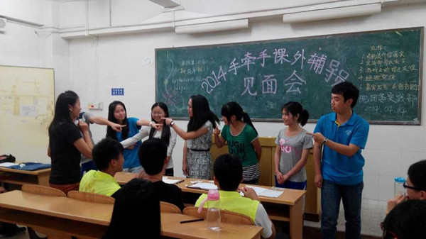 4月14日晚,我院团委社会实践部在教四401开展2014年“手牵手”课外辅导员见面会。“手牵手”课外辅导是我院首创的一项志愿者活动,主要的任务是到湛师附中对高一的学生进行“一对一”或“一对多”的辅导。