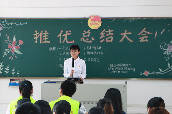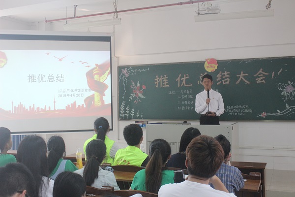 4月20日下午,化学化工学院在燕雷楼D栋501室举行推优总结大会,会议展示各支部推优工作的成果和亮点,对存在的不足提出完善建议,为学院推优工作的提高打下坚实基础。