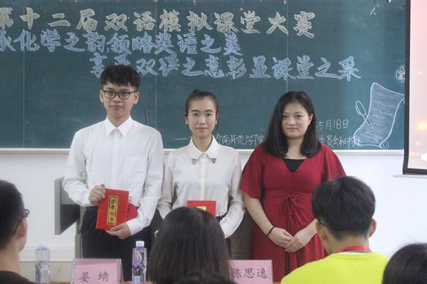 5月18日上午,化学化工学院在弘雷楼601室举办第十二届双语模拟课堂大赛决赛。决赛以“传承化学之韵,领略英语之美;享受双语之意,彰显课堂之采”为主题,旨在提高同学们探讨化学世界的积极性和运用英语授课的能力,检验对课堂知识的掌握成都。经过角逐,黎嘉慧获一等奖,苏卡莉、伍家振获二等奖;吴进弟,莫方婷,张懿琳获三等奖;朱文樱、连峻兴、杨丽心、卢欣宝获优秀奖。