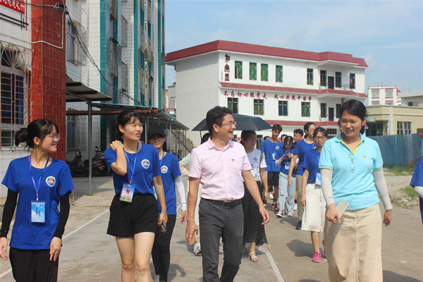 程向前一行人在队员们的带领下,先后参观了教学楼、宿舍以及饭堂,对队伍的食宿以及教学环境表示赞美,并询问了实践活动开展情况。队长刘美珊向他们汇报各项工作实情,她表示在队员们的齐心协力下,三下乡活动都能顺利进行。程向前与沙田一中沈洪波主任亲切地交手握谈,表示沙田一中的校园文化环境以及校园建设良好,并感谢沙田一中为“北极星”实践队提供的平台。