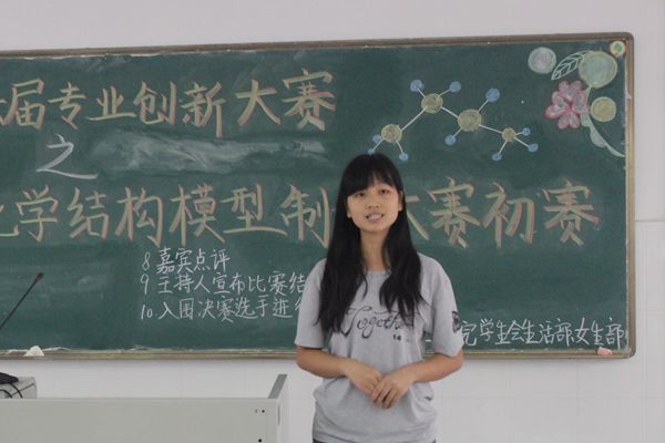 为了提高学生的实际操作能力,同时培养他们的创新思维和团结合作精神。11月21日早上,由化学化工学院学生会生活部和女生部联合主办的第六届专业创新大赛之化学结构模型制作大赛初赛在燕雷楼D栋301举行。出席本次大赛的有化学化工学院学生会副主席严尚隆,担任评委的有往届参赛获奖的温友红、欧光培、冯光媛、钱振凤、胡丽丽。