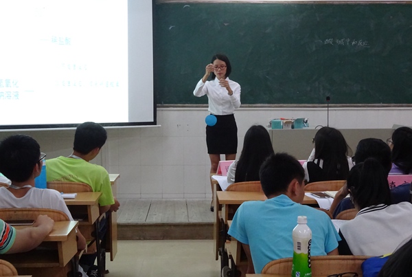 待主持人宣布完比赛的规则和注意事项之后,本次教学技能大赛之初赛也正式拉开了帷幕。在台上,选手们的说课生动有趣,从“教材分析”、“学情分析”、“教学目标”等方面展开说课。在授课环节上,各个选手都首先以“提出问题”的方式来引入课题,但他们带领“学生”探究问题的方式则各具特色,有的插入了实验视频;有的采用了板书的方式教学;有的进行了现场提问环节,与台下“学生”互动,一起探究问题;还有的则是现场给观众们做实验。其中,严智聪同学授课时声音洪亮,授课方式极为生动幽默。他在讲授《铁的重要化合物》时,把Fe3+比喻成一位大哥,SCN-比喻成Fe3+的好朋友,Fe2+比喻成Fe3+的弟弟,讲述了它们三者之间的关系。因此,他和黄小裕等6位同学在初赛中脱颖而出,顺利进入教学技能大赛的决赛。