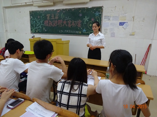 为给同学们提供一个模拟求职竞争平台,4月18日晚,由化学化工学院学生会公关部举办的第五届招聘模拟大赛初赛于燕雷楼c-212、213 举行。本次大赛邀请了学校招生与就业处各干部作为评委。