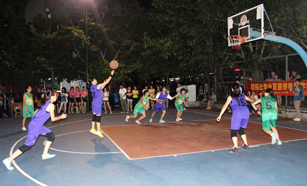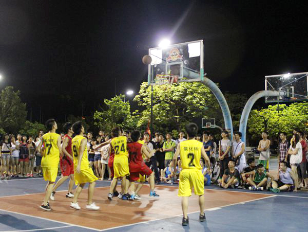 精彩的双节棍表演让现场气氛一度高涨,紧接着进行的是男篮冠军的角逐赛,11应化和12化本的队员们在观众的欢呼声隆重进场。此时,球场外的观众已经围得里三圈外三圈。裁判员的一哨令下,11应化球队的1号球员成功抢下了球,拉开了男篮比赛的帷幕。由于12化本的球员犯规,11应化队员获得罚球的机会,并成功投入了本场的第一个球。比赛紧张而激烈地进行着,两队的比分交替领先,两队不断上演反超戏码。11应化球队的1号球员以及12化本球队的24号球员的激动人心的争夺,让场上的尖叫声响彻云端。半场结束后,12化本球队以25:23的比分领先2分。