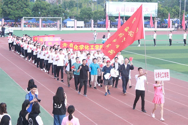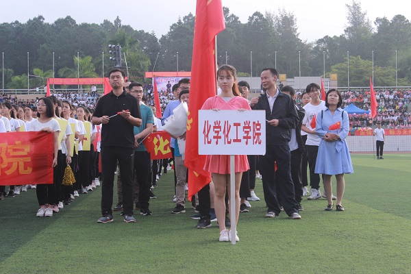 伴随着激昂的《义勇军进行曲》,看!迎面走来的是化学化工学院充满青春气息的整齐方阵。听!震动耳畔的声音是化学化工学院的口号:“青春激昂,我心飞翔,追求卓越,化院最强”。他们穿着整齐统一的服装,踏着矫健划一的步伐,热情挥舞着鲜艳的红旗,露出自信的笑容;他们精神抖擞,昂首挺胸,意气风发。化院方阵向全校师生展示出我院师生的满怀激情与青春活力并体现出我院学生带着饱满的精神和充沛的体力去迎接竞技比赛。