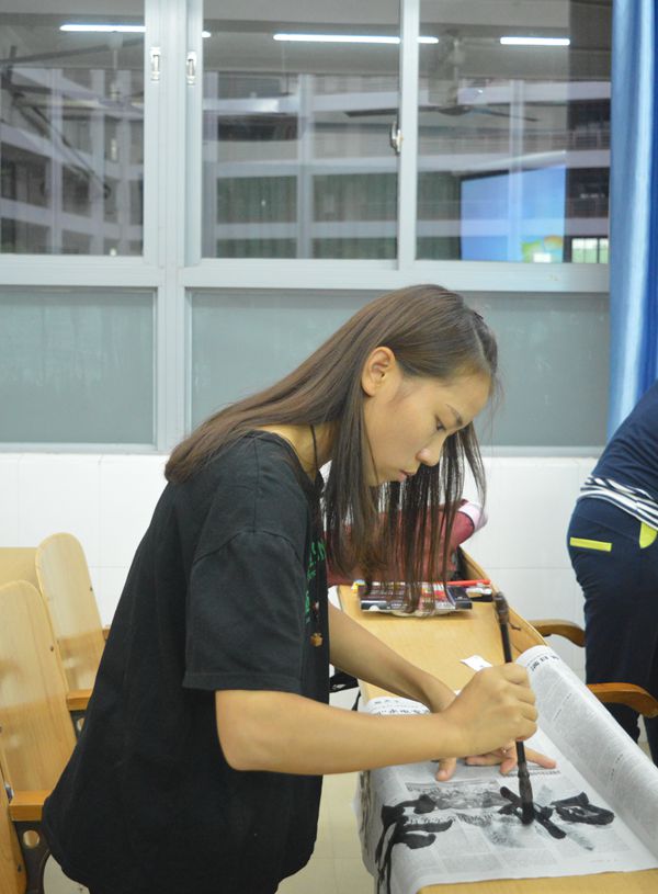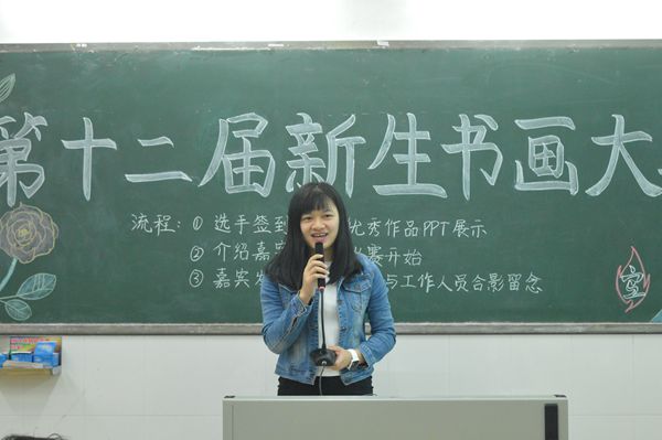 比赛开始前,宣传中心主任李舒萍同学上台发言肯定了宣传部全体干部为举行这次大赛背后所付出的努力,并希望选手们用心感受书法翰墨飘香的熏陶,大胆展示自我风采,更好地适应大学生活。随后,宣传部干部通过PPT展示了初赛优秀作品。选手们蓄势待发,比赛正式开始,同时选手们娴熟地拿出工具便很快地进入到比赛状态。选手们有的旁如无人地奋笔疾书,墨香顷刻间铺满纸面;有的在静静地思考,迟迟不肯下笔;有的认真勾勒线条,人物形态栩栩如生。期间,为了缓解选手的焦虑,并营造一个轻松的比赛氛围,干部们贴心地为参赛者播放了优美的音乐。