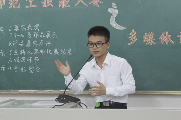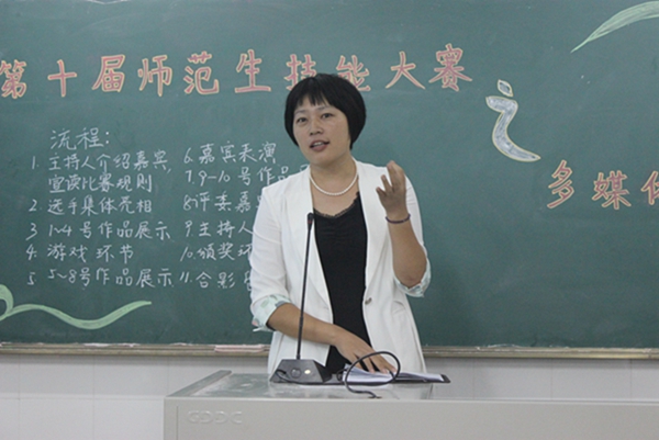 在主持人介绍比赛规则后,9位参赛选手集体亮相并进行独具一格的自我介绍。紧接着,参赛选手们通过AxeSlide、FOCUSKY、iebook、PPT、动态图等形式从教学重点、教学难点、教学内容等方面进行多媒体课件讲解,使现场观众直呼精彩,并送上阵阵掌声。每位参赛选手展示课件后,评委都从“在制作多媒体课件时是否遇到困难”、“制作软件的优点和缺点”等角度进行提问,且为选手们提出改进建议。