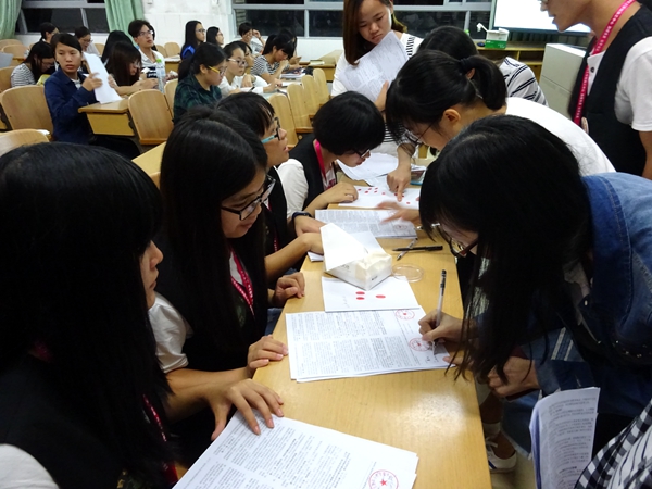 会议开始,贷款部干部甘能青向各位贷款生详细地讲解助学贷款合同签订的主要内容、注意事项以及贷款合同的填写等。紧接着,贷款部干部杜其星向大家介绍支付宝的使用方法,并在会议的过程中耐心地解答贷款生的疑问。他指出,支付宝助学贷款还款的新功能让还款更加方便和安全。另外,他还强调各贷款生必须在一个星期内完成支付宝的实名认证。随后,各贷款生有序地参与合同签名、按手印和宣读誓言环节。