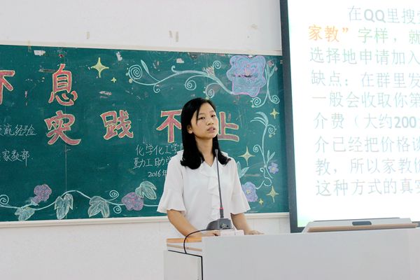 接着,梁绮霞给大家介绍自强社家教部的相关情况。她指出,家教部是一个有安全保障的、义务为在校学生尤其是贫困生提供家教工作的平台,让大家学习锻炼的部门。