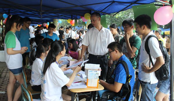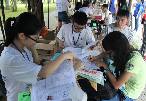 早上8点,校道早已经人山人海。大本营里,每到一位新生,助班便会把学生的档案、身份证复印件以及相关资料收齐,将预先存在信封里的东西如银行卡、饭卡等取出来,一一向新生们解释每张卡的用途和相关注意事项。此外,助班还给每位新生安排了宿舍并提醒他们注意自身安全以及财产安全。