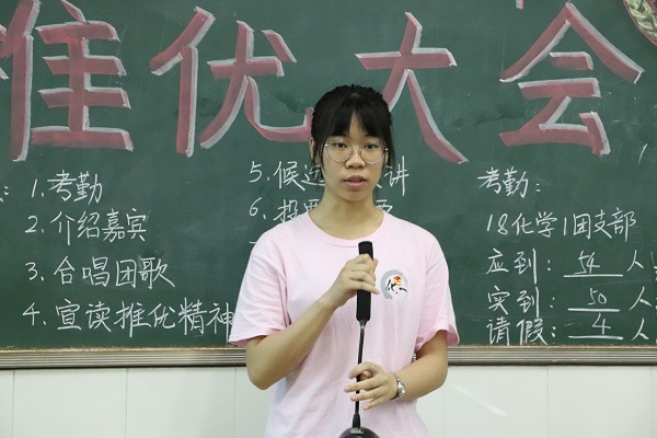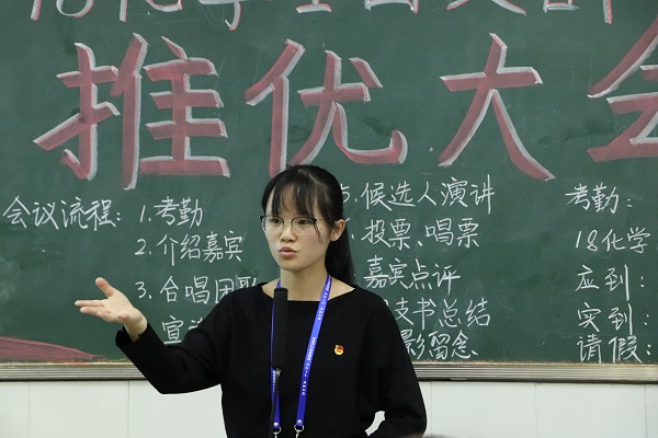 候选人演讲完毕后,支部成员积极配合负责人进行公平公正的投票、计票,最终确定本次推优大会成功推优的六位同学。伍琪琪表示18化学1团支部各位同学在本次推优大会中表现积极,并对推优候选人准备PPT、部分同学能够脱稿演讲表示肯定。