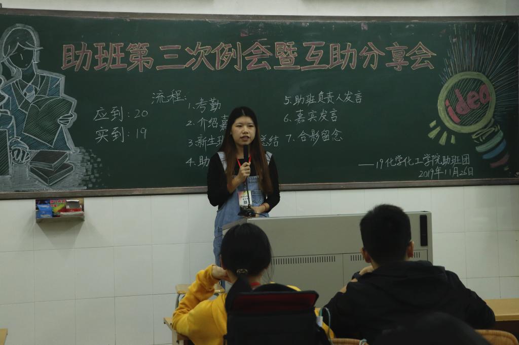11月26日晚上,化学化工学院于燕雷楼C栋401室举行2019级助班第三次例会暨互助分享会。化学化工学院辅导员董春庆老师以及全体19级助班出席了本次会议。此次会议目的在于总结开学至今新生班级情况,并为助班交流管理班集体心得和经验提供平台。