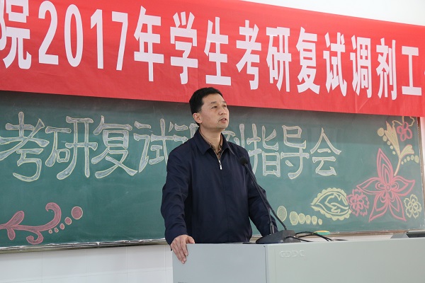 接着,王胜院长从认清形势,提高认识,转变观念三个方面,引导考研学子认真准备复试,理性对待调剂,力争取得研究生录取通知书。王院长肯定考研学子的努力和成绩,结合2017年全国研究生招考情况和自己的求学经历,详细讲述了当前社会对高层次人才的需求量大幅度上升,本科生就业难的现象,希望考研学子转变观念,树立信心,未来一定会更美好。王院长一番语重心长、循循善诱、又不失幽默诙谐的讲话,赢得了同学们的阵阵掌声。