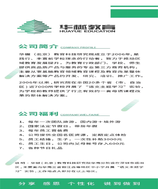 华樾(北京)教育科技研究院成立于2006年,是践行、丰富新学校理念的行动者,致力于推动区域教育发展提升,为教育行政部门、学校、师生提供高品质产品与服务的专业第三方教育机构,主要从事基础教育领域教育课程及教育改革整体解决方案等产品的开发、研究。