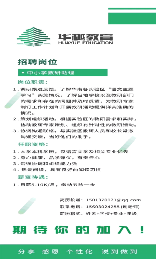 请有意者将个人简历发至招聘老师1501370021@qq.com或可直接来电咨询 15603024255(谢老师)。