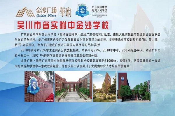 吴川市省实附中金沙学校,是经吴川市教育局批准,由广东省优质民办学校——广东实验中学附属天河学校与庞大投资集团强强联合创办的一所九年义务教育民办学校。